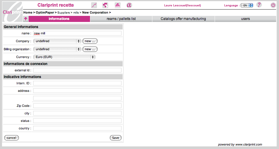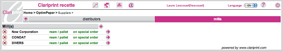 Access to the management of mills is done via the menu "Supplier" and "pop-up menu Mills."