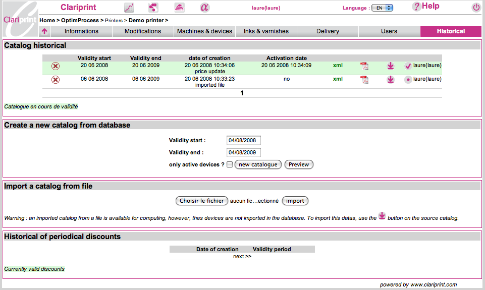 - Go to the submenu "Historical catalogs": your file is imported here.
