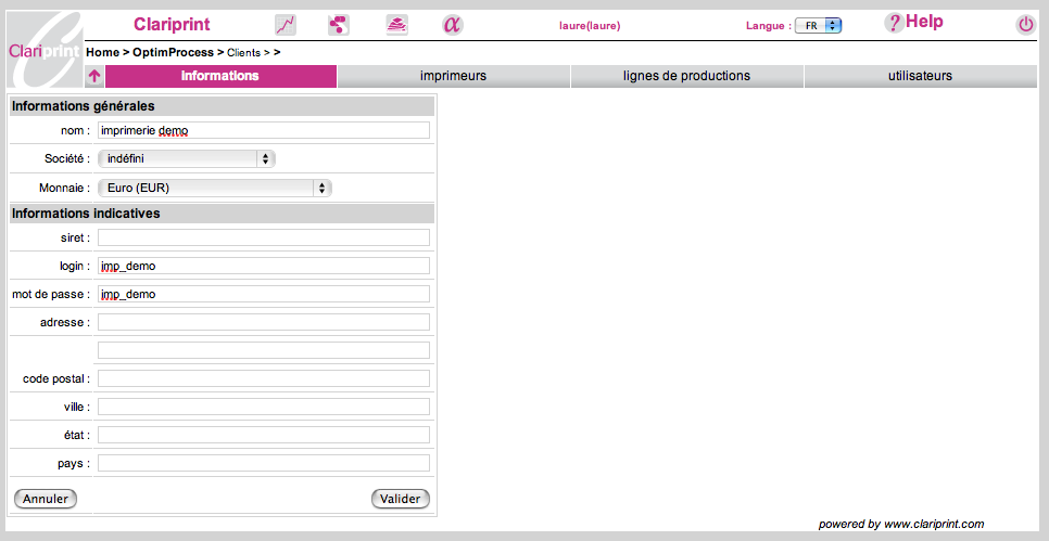 - Remplir la fiche et notamment dans "informations indicatives": login et mot de passe"( ils serviront plus tard dans un compte OptimProject)