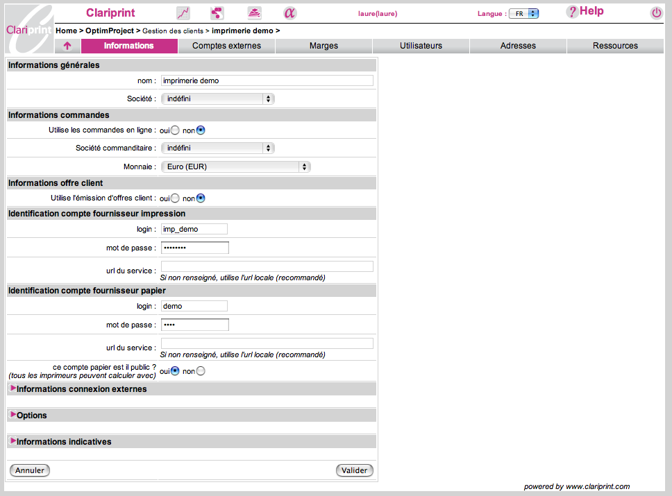 - Remplir la fiche en remplissant le "login" et "mot de passe" attribué précédemment dans le champ " identification compte fournisseur impression"