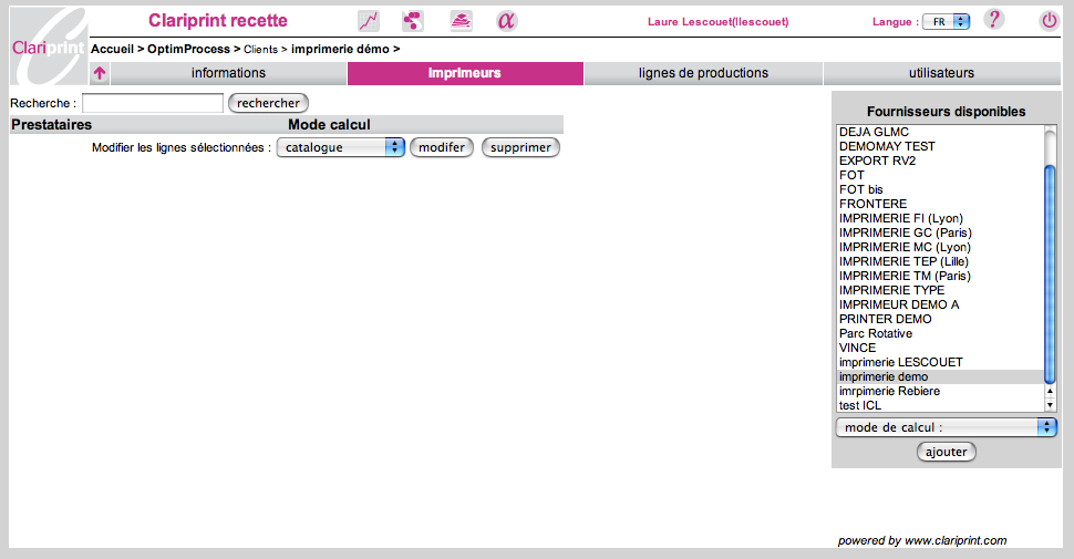 - Sélectionner le ou les imprimeurs à ajouter au compte dans le tableau de droite "fournisseurs disponibles". A gauche figure la liste des imprimeurs déjà référencés.