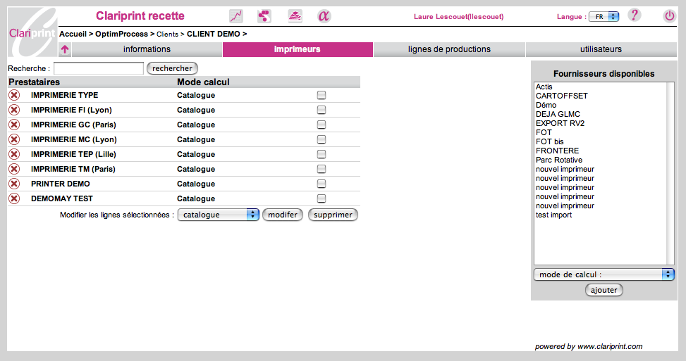- Sélectionner le ou les imprimeurs à ajouter au compte dans le tableau de droite "fournisseurs disponibles". A gauche figure la liste des imprimeurs déjà référencés.