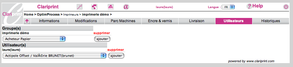 Référencement de l'utilisateur auprès du parc machine de l'imprimeur