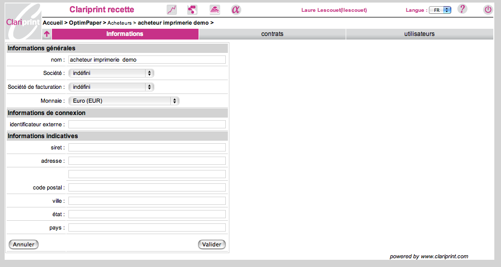 - identificateur_externe : identifiant unique représentant l'acheteur lors des échanges inter-application. Ce code doit comporter uniquement des chiffres et des lettres, et doit être unique.