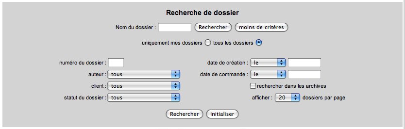 Ce formulaire vous permet d'effectuer une recherche d'un dossier déjà crée selon différents critères.